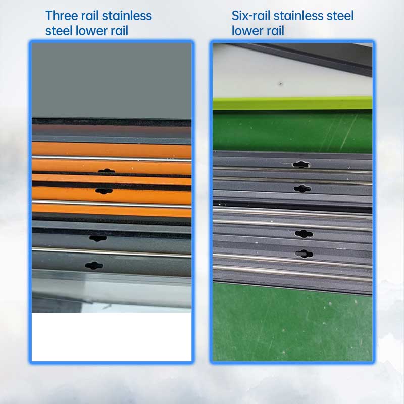 ດ້ວຍຄວາມຫນາຂອງ 3.0 ສໍາລັບການຕິດຕາມຕ່ໍາ, ການເລື່ອນລຽບແລະງຽບແມ່ນຮັບປະກັນ. ຂອບກັນນ້ຳທີ່ເພີ່ມເຂົ້າຊ່ວຍເພີ່ມການກັນນ້ຳ, ປ້ອງກັນການໄຫຼຄືນ. ຕັນຕ້ານການ derailment ສຸດ sashes ເທິງແລະຕ່ໍາຮັບປະກັນຄວາມຫນາແຫນ້ນ, ປ້ອງກັນບໍ່ໃຫ້ sash dislodgment. ໂຄງສ້າງການລະບາຍນ້ໍາ, ມີຮູລະບາຍນ້ໍາທີ່ເບິ່ງເຫັນ, ເຊື່ອງໄວ້ແລະຊັ້ນ, ປ້ອງກັນການຮົ່ວໄຫຼຈາກພາຍນອກເຖິງແມ່ນວ່າໃນຝົນຕົກຫນັກ. ແຖບປະທັບຕາທີ່ມີຫຼາຍຊັ້ນມີປະສິດທິພາບຫຼຸດຜ່ອນການໄຫຼຂອງອາກາດໃນການຕິດຕາມ, ປັບປຸງການປະຕິບັດການຜະນຶກໂດຍລວມແລະສະຫນອງຝຸ່ນ, ລົມ, ດິນຊາຍ, ແລະປ້ອງກັນຍຸງ.