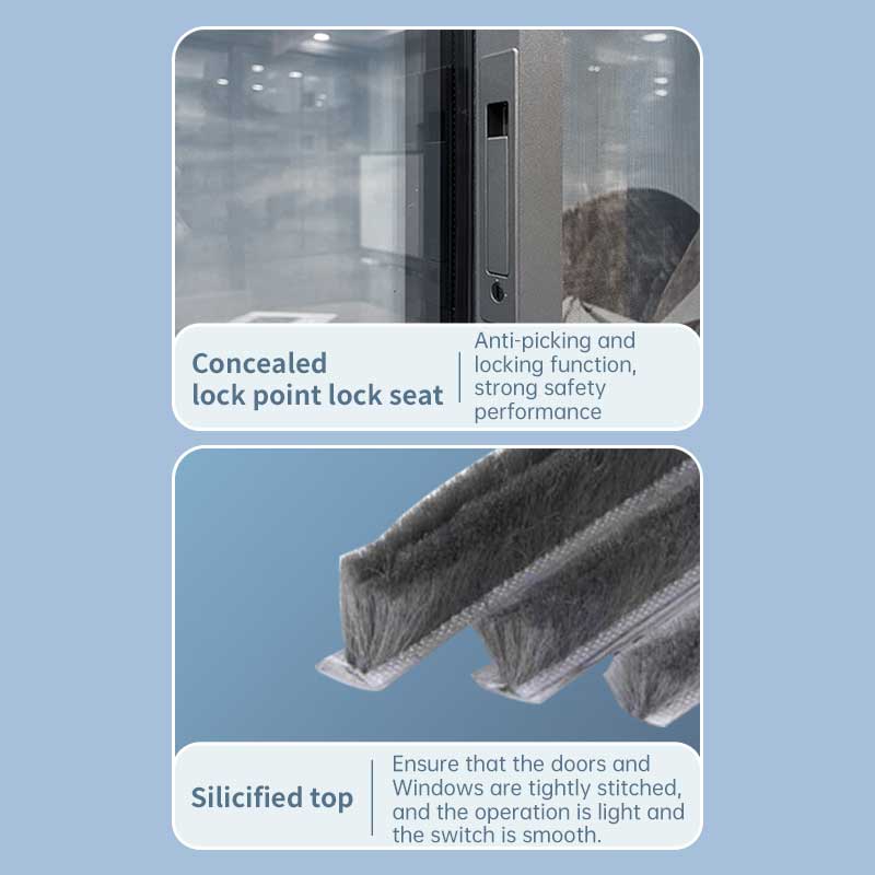 ເທກໂນໂລຍີການງໍຫນຶ່ງຊິ້ນຂອງແຖບອາລູມິນຽມທີ່ເປັນຮູ, ບວກໃສ່ກັບ butyl ທີ່ມີນ້ໍາ vapor permeability ຕ່ໍາແລະຢາງຊິລິໂຄນທີ່ເປັນກາງສອງອົງປະກອບ, ຮັບປະກັນການສນວນສຽງທີ່ດີກວ່າ. ແຖບອາລູມິນຽມແກ້ວທີ່ແຂງເປັນຮູແມ່ນເຕັມໄປດ້ວຍທາດດູດຝຸ່ນແລະອາຍແກັສອັດຕາເງິນເຟີ້, ສະຫນອງການສນວນສຽງ, ການຕໍ່ຕ້ານນ້ໍາ, ຕ້ານການຫມອກ, ແລະການປ້ອງກັນ mold. ການອອກແບບລູກມ້ວນຄູ່ຊ່ວຍເພີ່ມຄວາມສາມາດໃນການຮັບມື, ຮັບປະກັນການເລື່ອນລຽບ. ແຖບສະແຕນເລດທີ່ຝັງຢູ່ໃນເຄື່ອງຫັດຖະກໍາ, ມີສາມສາຍສະແຕນເລດ, ສະຫນອງຄວາມຫມັ້ນຄົງຕໍ່ກັບລົມແລະ sway, ຮັບປະກັນການເປີດກ້ຽງແລະງຽບ, ທົນທານ, ແລະການອຸທອນກ່ຽວກັບຄວາມງາມ.